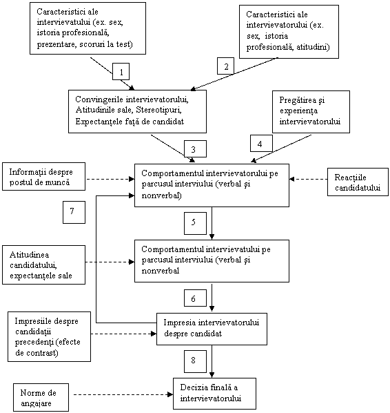 G.F. Dreher si P.R. Sackett (Landy. 1989) au construit un model a determinantilor deciziilor pe baza de interviu (Figura 7.1). Un lucru se desprinde cu claritate, acela ca decizia sau rezultatul interviului este determinata de interactiunea dintre persoana intervievata si intervievator. Se mai poate spune ca multe din variabilele care pot afecta rezultatele interviului, nu afecteaza cu nimic performantele la testele psihologice sau de cunostinte. De pilda, sexul intervievatorului poate influenta decizia de obtinere a unui post de munca, dar sexul celui care corecteaza testul nu va putea niciodata sa influenteze cota de test a persoanei careia i-a fost administrat testul in cauza.