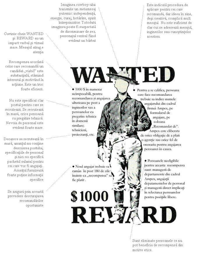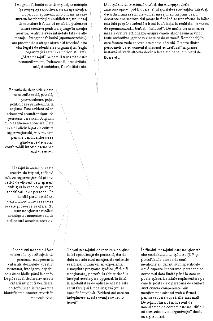 Studiu de caz. In urma citirii unor exemple de mesaje de recrutare reactia unui student la un mesaj de recrutare a fost ceva de genul: „Nu-mi place, ma oboseste, imi tot spune despre firma, despre misiune, despre cum vad ei viitorul, prea mult text, prea multa vorbarie. Mie imi trebuie un anunt cu bulet-uri, simplu, nu sa ma tot abureasca ei acolo”. Reactia altui student a fost: „Excelent, in felul acesta, indirect, subtil, prin stilul in care este scris atrage doar pe cei care impartasesc aceleasi valori, care au acelasi stil, care se potrivesc culturii organizationale”.