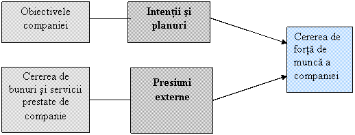 Cererea bruta de forta de munca este aratata în figura 4. Obiectivele organizatiei sunt transformate în intentii si planuri de evaluare si de asigurare de forta de munca suficienta, în timp ce cererea de bunuri si de servicii constituie o presiune externa asupra necesarului de forta de munca al organizatiei.