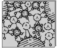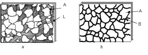 Fig. 5.2 Structura unui conglomerat: a-liantul reactioneaza cu agregatul si se integreaza in structura; b-liantul este consolidat cu agregat filerizat |