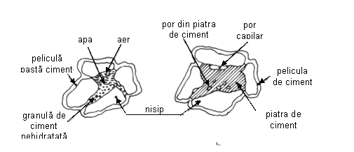5. porii de gel - au dimensiuni de regula sub 10-3 mm si sunt greu permeabili pentru apa in stare de agregare lichida; sunt inchisi sau interconectati cu pori capilari si sunt provocati de suctiunea interioara a apei din geluri catre granula nehidratata de ciment;