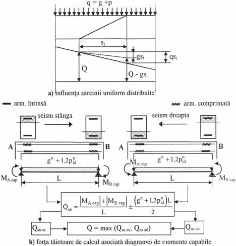 pentru riglele cadrelor antiseismice forta taietoare de calcul se ia asociata diagramei de momente capabile in sectiunile critice unde se initiaza curgerea armaturilor; mecanismul de cedare luat in considerare la stabilirea fortei taietoare de calcul este cu momente capabile de semne contrarii, la cele doua extremitati ale deschiderii (fig.4b).