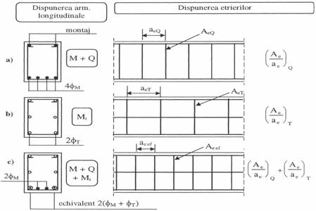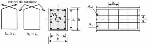 etrierii suplimentari pentru preluarea torsiunii se cumuleaza cu etrierii necesari pentru forta taietoare, daca acestia sunt prevazuti numai pe perimetrul sectiunii; daca etrierii au mai mult de doua ramuri verticale, cumularea se face numai pentru ramurile perimetrale; diametrul etrierilor si distanta dintre acestia se aleg in asa fel incat: