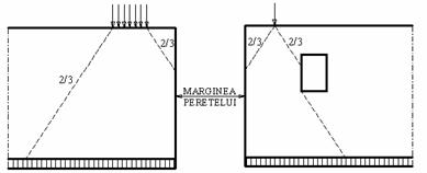 Pentru încarcarile locale, concentrate sau distribuite, se admite ca repartizarea în corpul peretilor se face cu o panta de 2/3 ca în fig.5.6a. În cazul golurilor în peretii structurali, linia de descarcare se deviaza conform fig.5.6b.