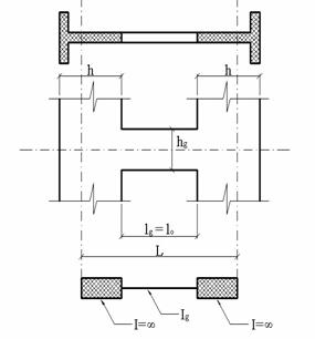 a) În calculul cu structura formata din bare, se tine seama de toate tipurile de deformatii produse de actiunea diferitelor eforturi sectionale: momente încovoietoare, forta taietoare si eforturi axiale. În cazurile curente se admite sa se neglijeze deformatiile datorate eforturilor axiale în grinzile de cuplare, precum si eforturile axiale din peretii structurali datorate încarcarilor verticale. b) Deschiderile teoretice ale cadrului etajat, care schematizeaza peretii cuplati cu goluri suprapuse, se iau între axele elementelor verticale. Pentru grinzile de cuplare (fig.5.7) se considera deformabila (la încovoiere si la forta taietoare) numai portiunea centrala lo, având lungimea luminii |