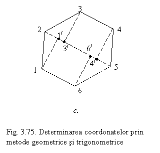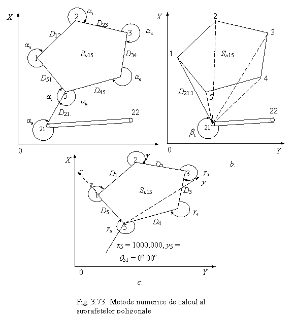 Aceste metode constau în împartirea poligonului în figuri geometrice regulate, triunghiuri (fig. 3.75.a si b), triunghiuri si trapeze (fig. 3.75.c) sau triunghiuri, dreptunghiuri, patrate, paralelograme, romburi, trapeze a caror arie se determina în functie de marimile cunoscute cu relatiile prevazute în Anexa nr. 1, Memoriu matematic.
