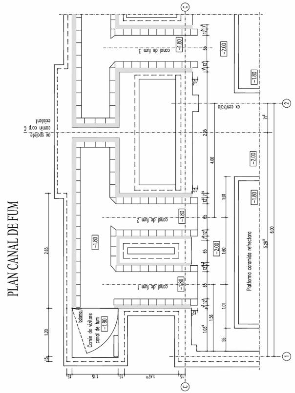 Sectiunea verticala a canalului de fum se caracterizeaza prin teserea zidariei de caramida refractara sub forma de bolta in plin cintru. Aceasta placare se realizeaza cu zidarie de 125 cm.