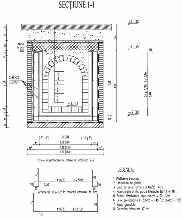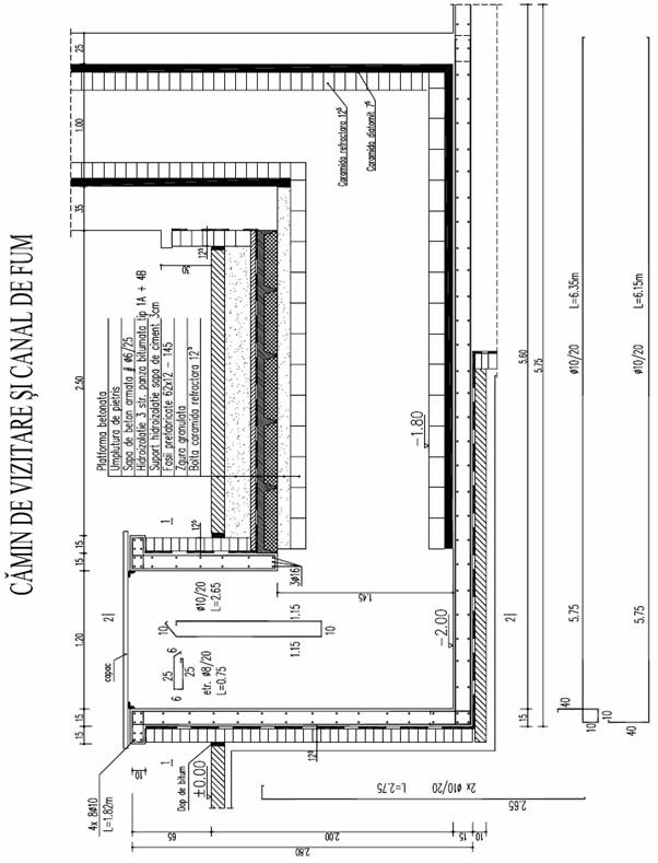 TEMA DE PROIECTARE se refera la datele de gabarit si functionale stabilite de specialitatea de Instalatii. La alcatuirea acestui obiectiv trebuie sa se tina seama de straturile succesive de izolatii termice ale betonului. Aceste izolatii, in cazul de fata, sunt realizate dintr-un strat de dialit de 75 cm si un strat de caramida refractara de 125 cm.
