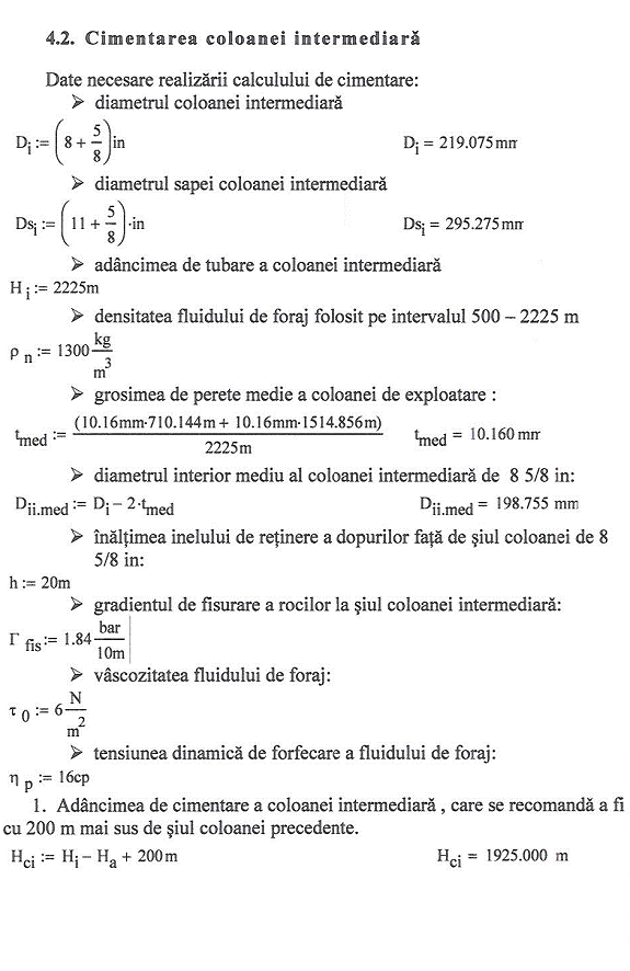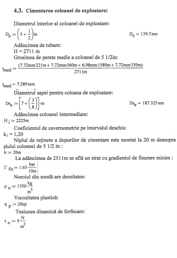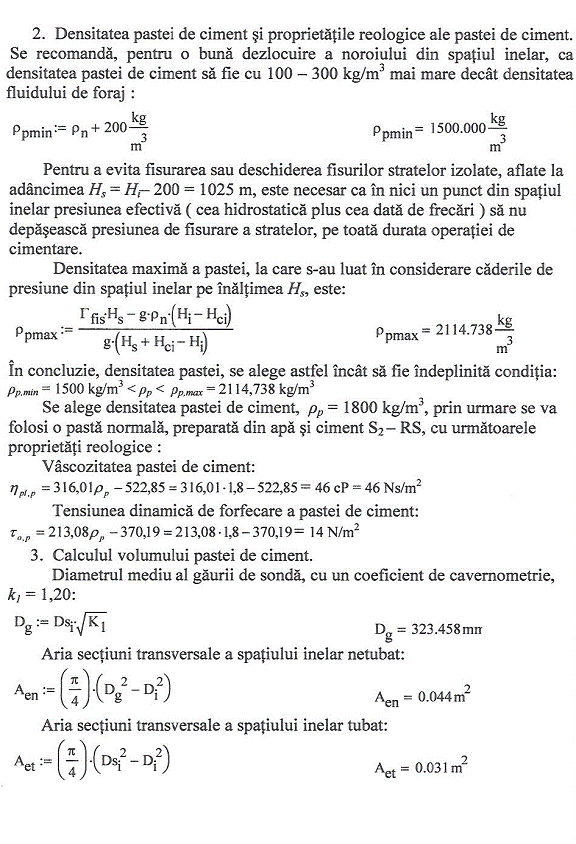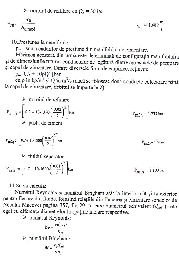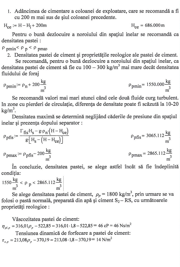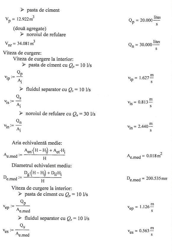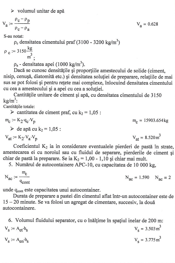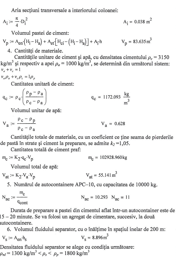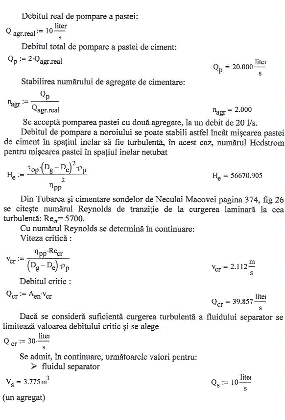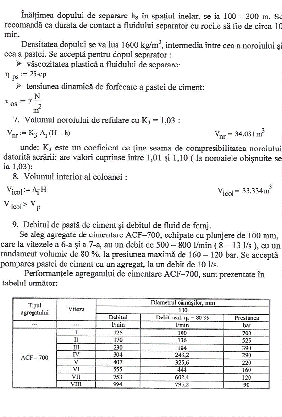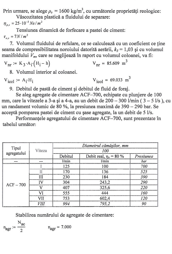 Se aleg agregate de cimentare AC-500, echipate cu plunjere de 115 mm, care la vitezele a 2-a si a 3-a, au un debit de 500 - 8001/min (8 - 13 1/s), cu un randament volumic de 80 %, la presiunea maxima de 130 - 100 bar. Se accepta pomparea pastei de ciment cu sapte agregate, la un debit de 111/s.