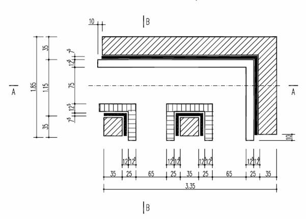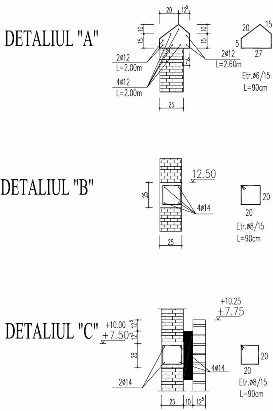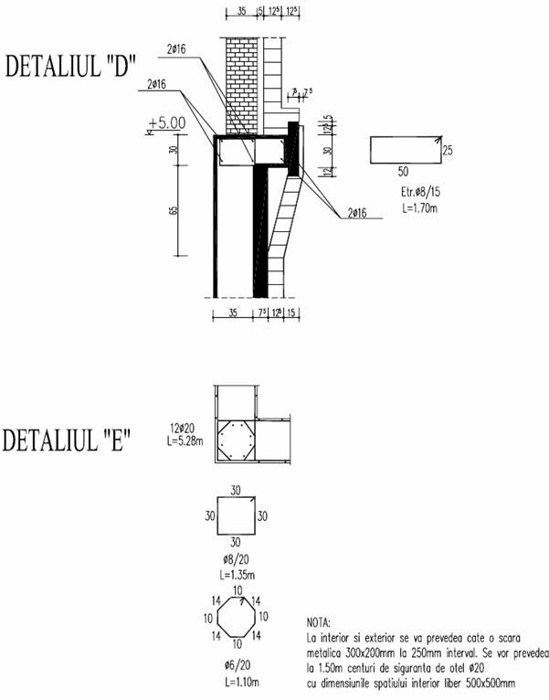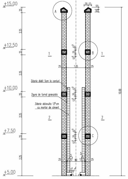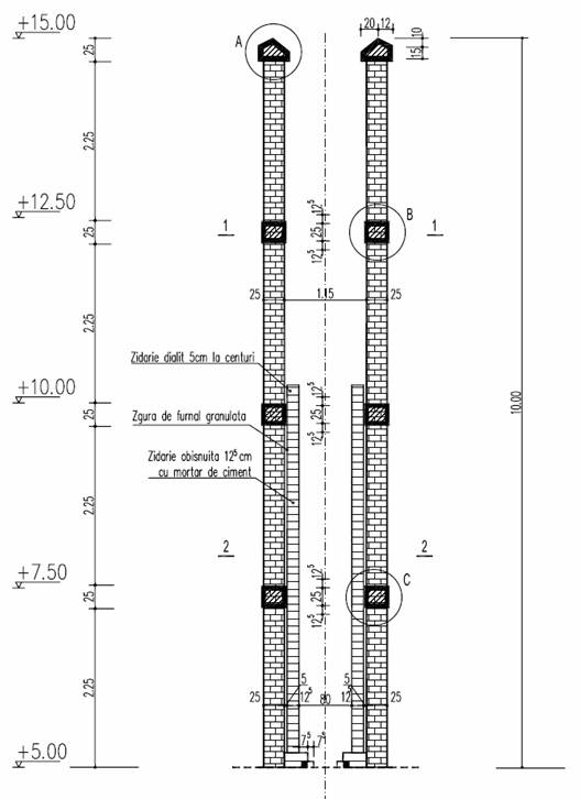 Detaliile caracteristice sunt prezentate in detaliile A, B, C, si D. Aceste detalii expliciteaza modul specific de alcatuire al centurii de capat, al centurii intermediare, al protectiei centurilor intermediare cu dialit si caramida refractara, precum si rezolvarea centurii peretelui de beton armat si protectia sa.