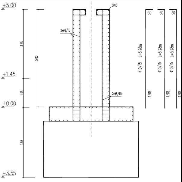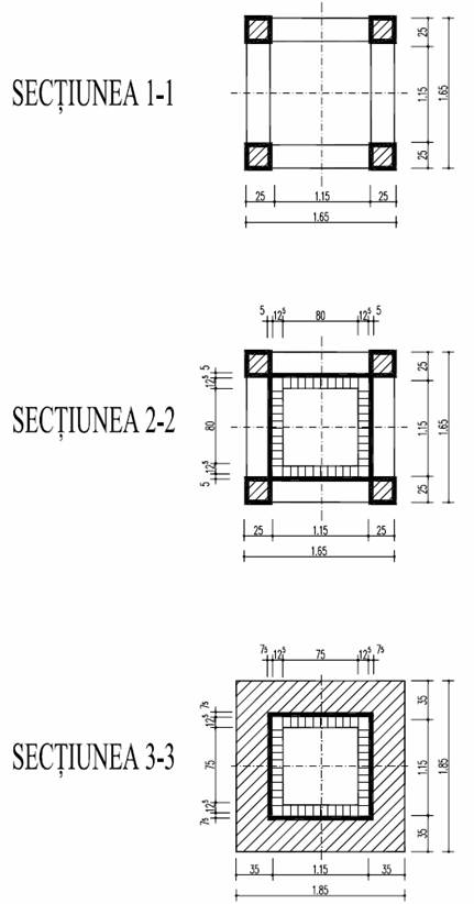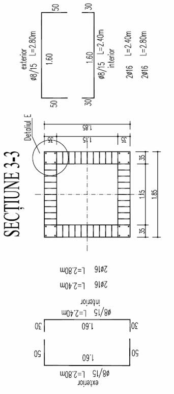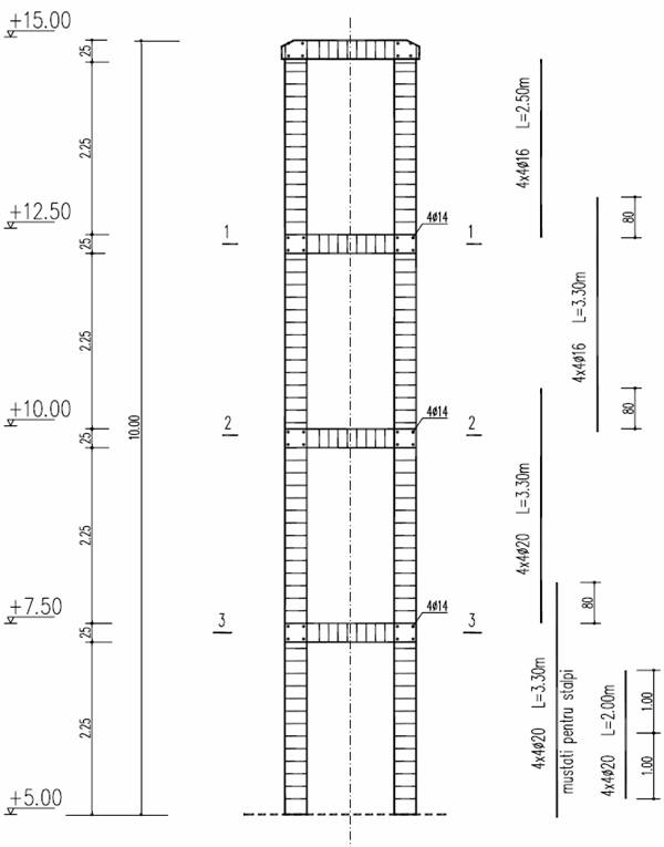 Aceste armari depind de tipul de solutie ales pentru structura de rezistenta. In acest caz, solutia este pe 1/3 din inaltime, la baza se realizeaza un tub din beton armat, iar in continuare stalpi si grinzi de beton armat de 25×25 cm.