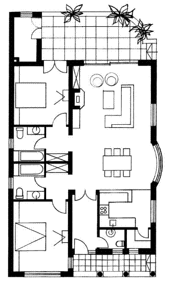 Un exemplu de locuin]\ rezolvat\ doar pe parter, a- ceast\ cas\ este conceput\ pentru o familie tân\r\. Suprafe]ele `nc\perilor sunt economice, dar func]i- onale, iar partiul este compact, zona de zi [i cea de noapte fiind delimitate judicios. Astfel, de la intrare se ajunge `ntr-un hol din care se distribuie, pe de o parte, dining-ul `n rela]ie direct\ cu o buc\t\rie deschis\ [i o c\mar\, [i living-ul dotat cu [emineu [i cu acces spre o teras\ ampl\. De cealalt\ parte a holului, se afl\ dou\ dormitoare deservite de o baie. |