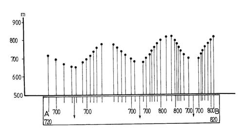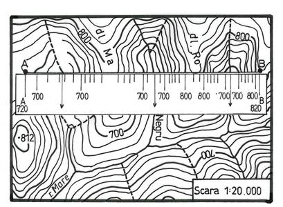 se unesc punctele cu o linie subtire si de-a lungul acesteia se aseaza o banda de hartie pe care se vor marca toate punctele de intersectie ale liniei de profil cu curbele de nivel si cu talvegurile vailor pe care acesta le traverseaza, inscriindu-se si altitudine punctelor respective (Figura 36b);