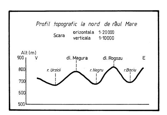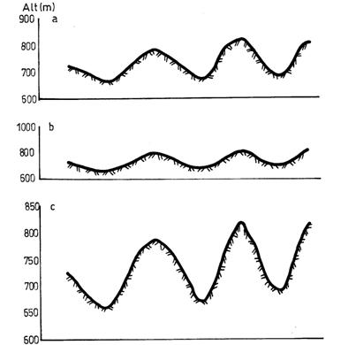 profilul topografic trebuie sa redea cat mai fidel aspectul reliefului din regiunea studiata. De exemplu, in zonele deluroase relieful este alcatuit in general din culmi rotunjite si culoare de vale mai largi (Figura 39a). Daca vom exagera prea putin pe verticala zona deluroasa va capata mai degraba aspectul unei regiuni de campie (Figura 39b), iar daca exagerarea va fi prea mare, aceasta se va transforma intr-un relief montan tipic, cu creste ascutite si culoare de vale inguste, cu versanti abrupti (Figura 39c);