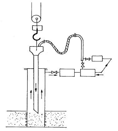 Instalatia utilizata pentru spalarea directa este schematizata in figura 4.26 si cuprinde la suprafata o pompa de spalare si un cap de injectie (cap hidraulic de tip usor). Legatura intre ele se realizeaza prin intermediul unui incarcator si al unui furtun elastic