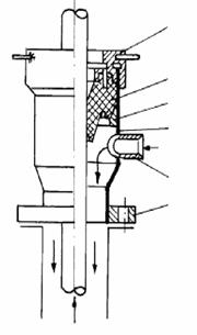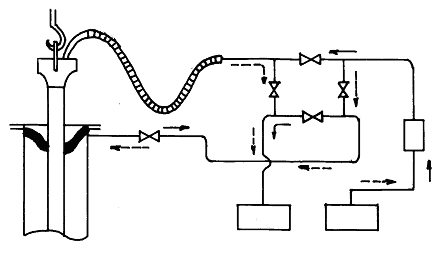 Instalatia pentru spalare indirecta (fig. 4.29) se compune din acelasi utilaj ca si la spalarea directa, avand in plus la gura sondei un dispozitiv de etansare a spatiului inelar (coloana de exploatare - tevi). In acest scop se poate utiliza un prevenitor de eruptie cu bacuri, care in timpul spalarii este inchis pe tevi. Etansarea spatiului inelar se poate realiza si cu un dispozitiv de spalare cu garnituri deformabile (fig.4.30).