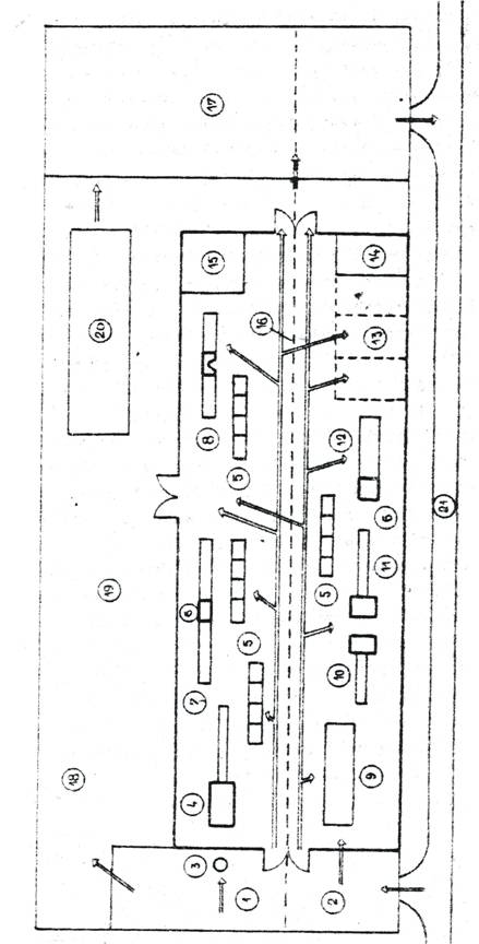 b) Pe palatforma exterioara colacii se pun pe o vartelnita si se descolacesc cu troliul electric;vergelele se intind;se taie la lungimile dorite ;se fasoneaza si se asambleza in plase sau carcase fie pe platforma 19 ,fie in sopronul 20;de aici se duc in depozitul de armatura finita 17.