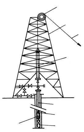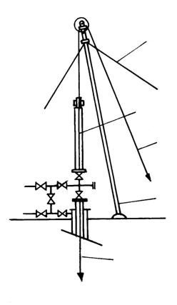 1.Instalatia de tip greu (fig. 4.4) consta din:curatitor tubular tip A sau lamelar greu tip B, prajina grea, racord fix, cablu cu diametru de 12 - 16 mm, cap de coloana pentru pistonat si un troliu de interventie. Ghidarea cablului se face peste geamblacul turlei de productie.