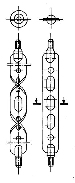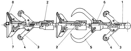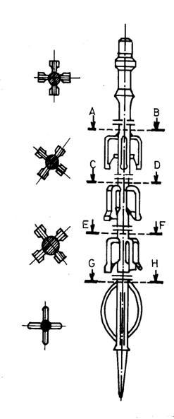 ♦ Curatitorul cu cutite tip D (fluture) din figura 4.7.b. este format dintr-o tija de otel pe care sunt sudate trei etaje de cate patru cutite