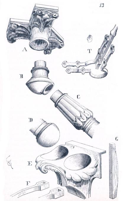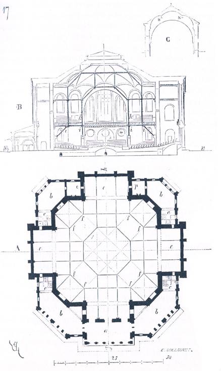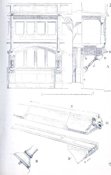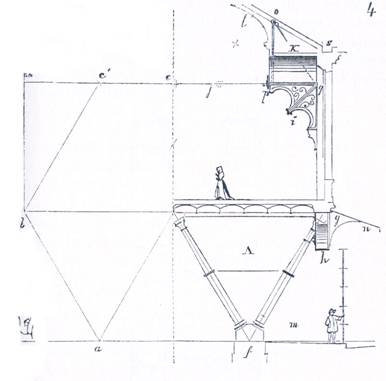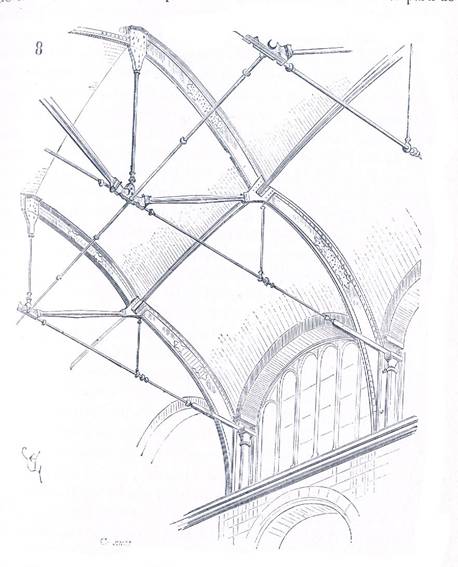 Armatura poliedrului din fier se va asza pe opt coloane din fonta care transmit incarcarile pe bratele de forta oblice i. Acestea vor purta in acelasi timp tribunelek. Peretii celor patru apendice vor buta impingerile intregului sistem, impingeri reduse, de altfel, la o actiune foarte slaba. Aceste apendice vor fi boltite (asa cum se vede in sectiunea C, facuta dupa op) pe arce din tabla s, astfel incit sa nu mai exercite presiune asupra coamelor zidurilor. Se va observa ca fiecare membru rectiliniu al armaturiii este de lungime egala si ca aceasta lungime este de aproximativ 8,60 m, pentru poliedru ca si pentru celelalte parti ale boltilor. Vom reveni asupra formei acestor membre si asupra decoratiei lor, cind ne vom ocupa in mod special de lacatuserie.