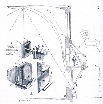 Iata deci un mijloc de preluare a boltilor din zidarie construit dupa datele Evului Mediu. Se stie ca aceste bolti au avantajul (fara sa mai vorbim de supletea lor) ca descarca toate sarcinile si impingerile in puncte cunoscute si dupa inclinatii usor de calculat. E limpede ca daca rezultanta presiunilor actioneaza dupa linia ab, coloana de fonta c , asezata in prelungirea acestei linii, va prelua impingerile boltii :