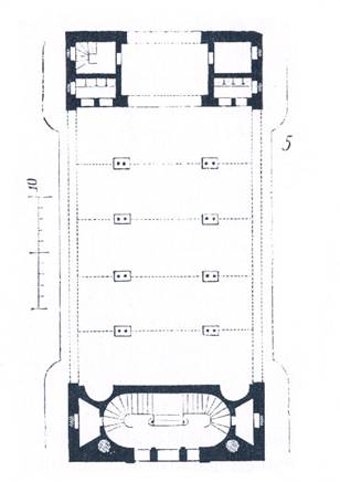 Cum scarile vor deveni o necesitate, ca si spatiile anexa si mijloacele de incalzire pentru aceasta sala superioara, ansamblul planului va avea configurasia din figura 5 si aceste constructii de capat vor stabiliza miscarea traveilor parterului in sens longitudinal.