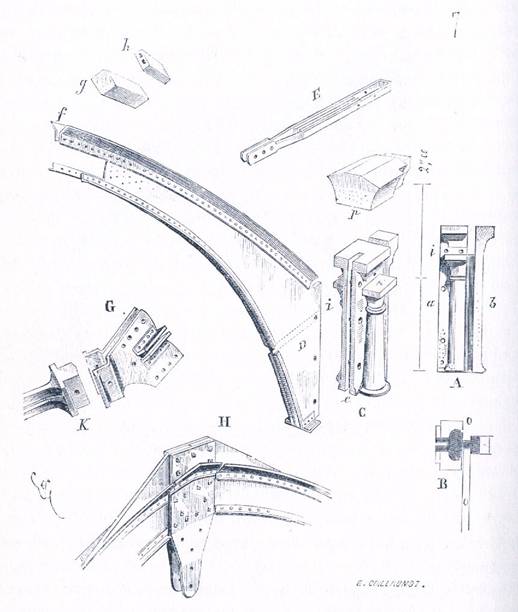 Curbele din platbanda D, se insereaza in santurile e ale acestor suporti, la intrados curbele sint armate de cornierele f, care primesc moeloanele g pe care se sprijina caramizile h, care compun boltile inelare. In E, este desenata prinderea in doua parti a tirantilor, trecind prin i. In G, placile de asamblare marcate b in figura 6, cu extremitatea k a uneia dintre legaturile din fonta. In H, placile de asamblare marcate cu g in figura 6. In o, ar trebui sa fie dispuse sasiurile ferestrelor. Pe suporturile din fonta s-ar aseza suportii p din piatra, primind arcele alcatind golul suprafetei vitrate. O vedere perspectiva, figura 8, va completa intelegerea acestei structuri.
