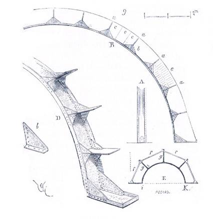Aspectul acestei structuri e prezentat in figura 18, multumita acestei retele de fier, portiunile de bolta ar putea fi realizate din materiale foarte usoare care sa nu produca decit incarcari neinsemnate. Vedem ca aceste portiuni de bolta , intre ochiurile retelei din fier, sint compuse din arce care ar putea fi realizate fie din caramida mulata, fie din piatra moale, ca umpluturile pot fi realizate fie din ceramica fie din caramizi sparte. Cintrajul acestor boltisoare reazema pe armatura, chiar daca ea ramine independenta, vizibila sub boltisoare si nu serveste decit sa le poarte catre punctele de sprijun ale arcelor lor divizoare.