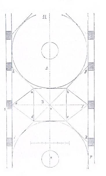 Pornind de la aceasta figura generatoare, putem organiza hala de sub marea sala de la primul etaj asacum o indica traseul A. Pe suportii f din piatra bine fundati, separati dupa latimea necesara fiecarei travei, asezam coloane de fonta inclinate la 60 de grade. Capitelurile acestor coloane sint unite prin platbande de tabla transversale care primesc profile T metalice, pe care asezam boltisoare din zidarie. Pe sabotii g, care pot fi suspendati prin etrieri inchisi cu fonta la partea inferioara pentru a putea suporta suportii arcelor din zidarie h, se vor ridica peretii, tot din zidarie, ai salii. Echerele din fonta i, in doua parti, legate de tirantii j , si ale caror impingeri la baza vor fi neutralizate de triunghiurile opq, osq, ar primi, la rindul lor boltisoare longitudinale k, pe care va sprijini bolta superioara. O conditie esentiala ar fi sa se fundeze suportii f, nu pe blocuri izolate, ci pe pereti transversali, intrucit este important ca picioarele coloanelor fg, ab, sa se apropie, sub presiune, si sa faca astfel sa se ridice coloanele triunghiului interior.
