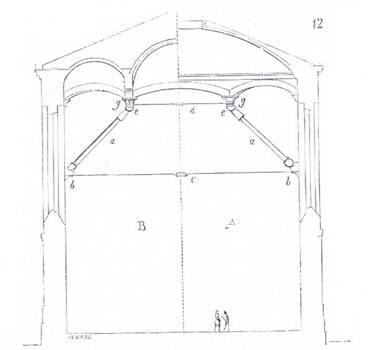 Picioarele de forta sau coloanele inclinate a, sint din fonta, sprijina in b, in saboti tot din fonta, armate de un tirant c. Picioarele acestor brate de forta sint sferoizi si intra indoua alveole practicate in fiecare dintre saboti. Capetele acestor brate de forta patrund cu suportii in sferoizii e surmontati de prinderi care intra si ele cu suportii in capiteluirilr din fonta g, care primesc fiecare reazemele a trei arce. Punctele de prindere sint legate cu tiranti d, care impreuna cu arcul de deasupra, formeaza o latura a sasiului patrat pe care se sprijuna bolta in cruce si o parte a cupolei. Astfel, aceste patru arce cu tirantii lor nu vor exercita nici o impingere, Numai arcele ah, di, bg,ck (vezi planul din figura 11), ar putea exercita o impingere pe zidurile laterale. Dar daca, deasupra acestor arce inseram o armatura circulara din fier care s-ar insera la baza cupolei, aceasta impingere, deja foarte oblica, ar fi neutralizata.