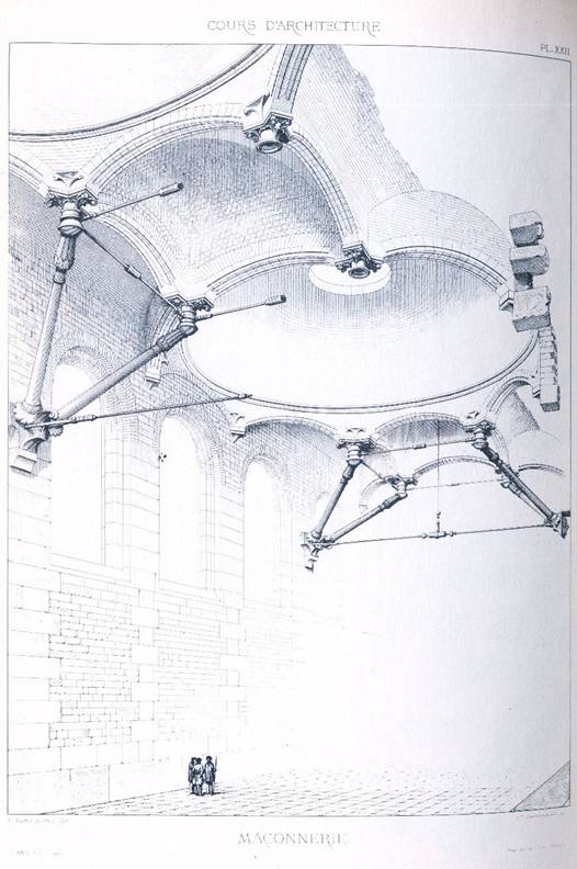 Se stie cum arhitectii Evului Mediu, in Franta, contrabutau boltile prin mijloace simple, naturale, prin contraforti sau chiar prin arce butante. Sint rezistente exterioare pasive sau actionind oblic. In Italia, arhitectii adoptau un partiu mai simplu, ei puneau tiranti din fier orizontal deasupra nasterii arcelor acolo unde se produc impingerile. Aceasta pentru ca intr-adevar, pentru a rezista la impingerea boltilor, trebuie sa dispunem fie culee fie tiranti care sa impiedice expansiunea. De ce ochii nostri care nu ar suporta prezenta tirantilor interiori sub boltile noastre zidite in Franta, nu sint socati de cei pe care monumentele Italiei ii etaleaza pretutindeni ? Nu voi cauta sa explic aceasta bizarerie, voi constata numai ca artistii care deseneaza monumentele Italiei medievale sau renascentiste, suprima acesti tiranti din fier din copiile lor, ceea ce ma face sa presupun ca pentru ochii lor ei nu conteaza; De ce socheaza ei prin aceasta ? As adauga ca tirantii atasati nasterii boltilor italiene nu afecteaza nici o pretentie decorativa, sint niste bare de fier. E bine totusi ca preotii italieni nu au avut fantezia sa taie toate aceste bare din bisericile lor, asa cu preotii francezi au taiat contravintuirile tuturor sarpantelor lambrisate, pentru ca astfel ar fi facut sa cada o multime de edificii care stirnesc admiratia turistilor.