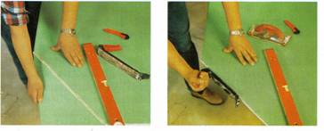 se taie in doi timpi, mai întâi se taie cartonul cu cutterul ghidat de o rigla, dupa care se pune placa pe 10310v218k o suprafata usor înaltata si se rupe placa cu o miscare rapida, se ridica în picioare si se taie placa si pe partea cealalta.
