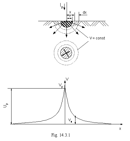 Curentul Ip se distribuie in pamant uniform si simetric, in directie radiala, iar densitatea de curent la o anumita distanta x de centrul electrodului