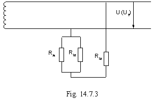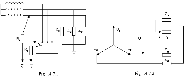 Pe baza figurii 14.14.2, se poate arata ca tensiunea de contact corespunzatoare unei anumite rezistente de izolatie a retelei Riz, in cazul unei singure puneri la carcasa, la un echipament, este data de relatia :