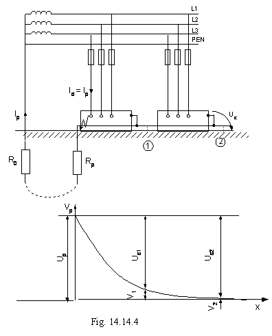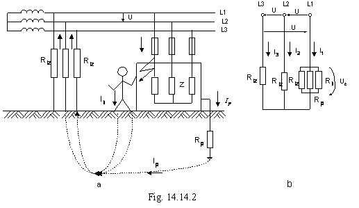 Toate elementele conductive, in particular carcasele metalice ale echipamentelor electrice, care pot intra accidental sub tensiune si care pot fi atinse de catre personal sunt legate la pamant prin una sau mai multe prize de protectie in paralel iar neutrul este legat la pamant la transformator printr-o priza de exploatare (fig. 14.14.3).