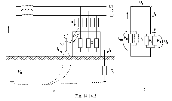 La aparitia unui defect ( punere la carcasa) la echipamentul a carui carcasa metalica este legata la o priza de pamant cu rezistenta Rp (fig. 14.14.3-a), se stabileste un curent de defect Id care, in cazul atingerii de catre om a carcasei, se determina pe baza schemei echivalente din figura 14.14.3-b. Neglijand rezistenta electrica a conductorului fazei defecte si considerand o punere neta la carcasa ( Rd 0), rezulta :