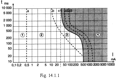 Riscurile de imposibilitate a desprinderii, oprire a respiratiei sau de fibrilatie cardiaca ireversibila cresc proportional cu durata trecerii curentului prin organism, fapt ilustrat in figura 14.1.1 in care efectele curentului alternativ (15 ¼ 100 Hz) sunt diferentiate in patru zone (CEI 60479-1) dintre care zonele 3 si 4 reprezinta un pericol real. In zona 3 (intre curbele b si c1) nu se manifesta afectiuni organice, dar sunt probabile contractii musculare, dificultati de respiratie, perturbatii reversibile ale functionarii inimii. In zona 4, pe langa efectele corespunzatoare zonei 3, probabilitatea de fibrilatie ventriculara este : circa 5% intre curbele c1 si c2, sub 50% intre curbele c2 si c3, peste 50% incepand de la curba c3.