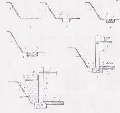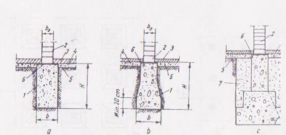 a) dreptunghiulara; b) cu evazari; c) cu trepte; 1.fundatie, 2.zid portent 3.pardoseala; 4.strat-suport; 5.teren; 6.izolatie hidrofuga; 7. umplutura de pamant.