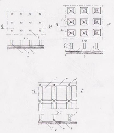 a) cu placa dreapta ; b) tip ciuperca ; c) cu frinzi : 1. placa (dala) de fundatie ; 2. strat de beton de egalizare ; 3. stalpi ; 4. grinzi de fundatie ; 5. capitel.