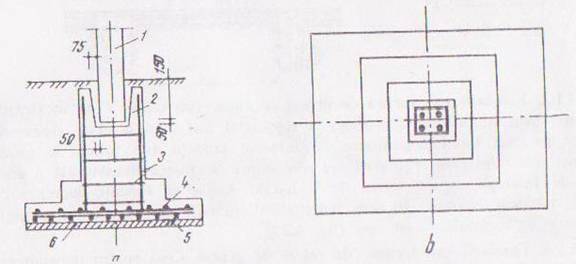a) sectiune b) plan, 1,stalp 2.paharul fundatiei 4.armatura talpii de fundatie 5 strat de beton de egalizar