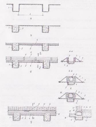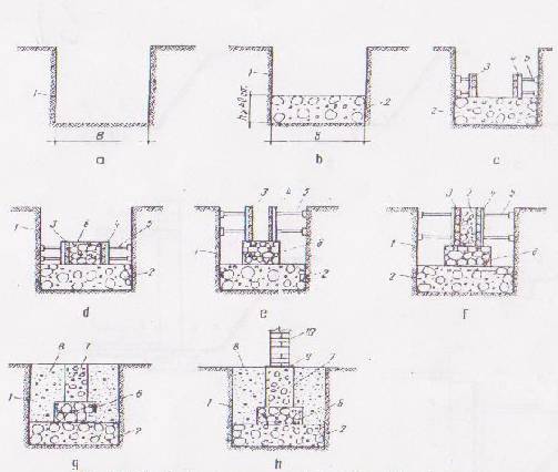 c)executarea stratului de pietris si a betonului de egalizare d)montarea panourilor laterale ale cofrajelorgrinzilor de descarcare e) montarea armaturilor in grindade descarcare f) turnarea si vibrarea betonului in grinda de descarcare g)decofrarea partilor laterale ale grinzii, executarea hidroizolatiei orizontale sub peretele, executarea umpluturii a peretelui placii-support a pardoselii ; 1.gropi pentru reazemele izolate ;2.reazemele izolate ; 3 pietris ; 4.beton de egalizare 5.panou de cofraj ;6.montant ;7.sprait ;8.tarus.9.armatura de grinda de incarcare 10. grinda de descarcare ; 11.hidroizolati orizontala 12.perete ;13. umplutura ; 14.pietris.15.placa pardoseala ; 16.nisip ;17.trotuar ; 18 dop de bitum.