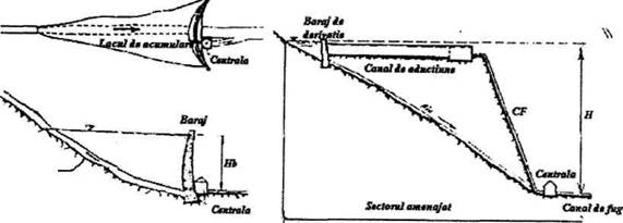 Scopul amenajarilor hidroelectrice este de a concentra caderile disponibile si debitele pe sectoare scurte. Exista cazuri cand acest lucru este realizat, sau cel putin favorizat de anumite conditii naturale, cum ar fi cazul cascadelor, sau cel al unor lacuri sau cursuri de apa invecinate, dar situate la cote diferite. In cele mai multe cazuri insa se recurge la mijloace artificiale si din acest punct de vedere exista urmatoarele tipuri principale de scheme de amenajare ale unui rau: