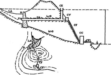 b) prin derivarea apei pe un canal de aductiune cu panta redusa,care sa asigure conditii de scurgere mai favorabile si sa creeze astfel caderea necesara. O astfel de amenajare se numeste amenajare de derivatie si ea este specifica cursurilor mijlocii ale raurilor, deci in zonele de deal. Din lacul de acumulare apa este deviata pe un canal de derivatie, cu o panta mai mica decat cea naturala a raului, traseul canalului fiind aproximativ paralel cu al raului. La capatul aval al canalului deschis, apa este pusa sub presiune intr-o camera de incarcare si apoi dusa la cladirea centralei printr-o conducta cu panta foarte mare, numita conducta fortata. Dupa turbinare, apa este restituita raului printr-un canal deschis numit canal de fuga.