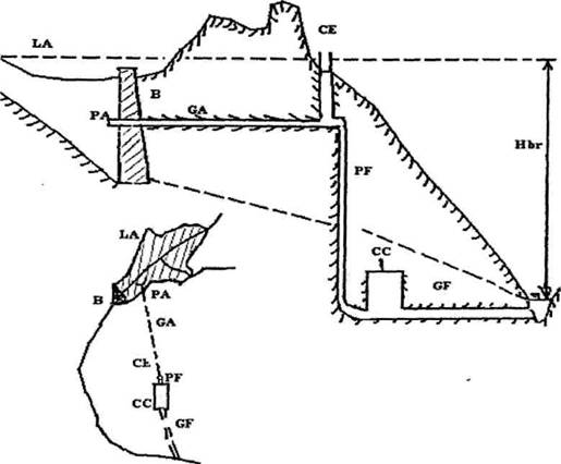 c) Printr-o solutie mixta, cu ridicarea nivelului apei prin barare si derivare printr-o tubatie sub presiune; aceste amenajari se numesc amenajari mixte, in figura 2. a) fiind reprezentata o amenajare cu cladirea centralei la suprafata, iar in figura 2.b) o amenajare cu centrala situata in subteran. In cazul acestor scheme, specifice zonelor muntoase, deci cursurilor superioare ale raurilor, barajele sunt mai inalte si realizeaza acumulari mari.