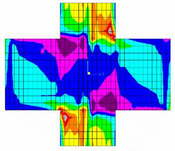 - eforturile unitare în primele doua rânduri de armatura (de la partea superioara si din mijlocul dalei) ating valoarea maxima de 220N/mm˛ ceea ce conduce la concluzia ca mai au rezerve de capacitate portanta;eforturile unitare în cel de-al treilea rând de armatura (cel care se gaseste la partea inferioara a dalei) ating valoarea maxima de 425N/mm˛;