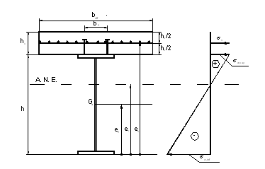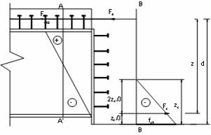 Figura 3.5 reprezinta principiul de calcul adoptat considerând o sectiune de calcul A - A' în vecinatatea reazemului cu distributia eforturilor unitare în profilul metalic si armatura respectiv o sectiune B - B' în îmbinare, cu o distributie triunghiulara a eforturilor de compresiune în beton si efortul de întindere din armaturi.