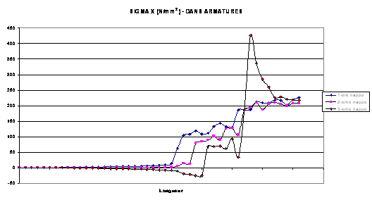 Figura 3.15 - Distributia eforturilor unitare sx în cele trei rânduri de armatura la rupere |