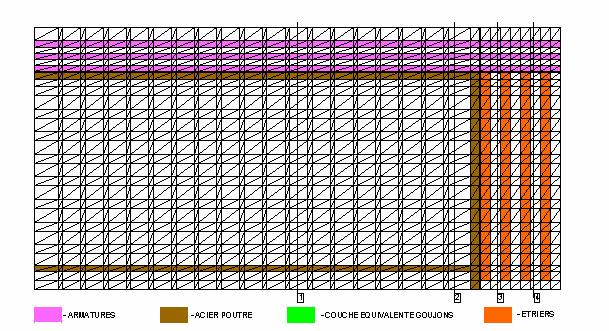 Un alt model studiat a fost cel cu etrieri în îmbinare si cu straturi echivalente pentru conectori atât la nivelul grinda metalica-dala de beton cât si la nivelul placii de capat de la interfata îmbinarii propriu-zise. Discretizarea îmbinarii este prezentata în figura 3.12. Au fost pastrate pentru reprezentarea eforturilor unitare x aceleasi sectiuni caracteristice cu scopul de a putea face o comparatie a nivelului de solicitare din îmbinare.