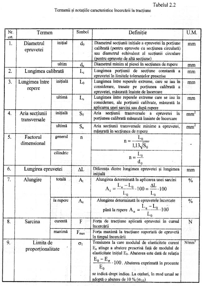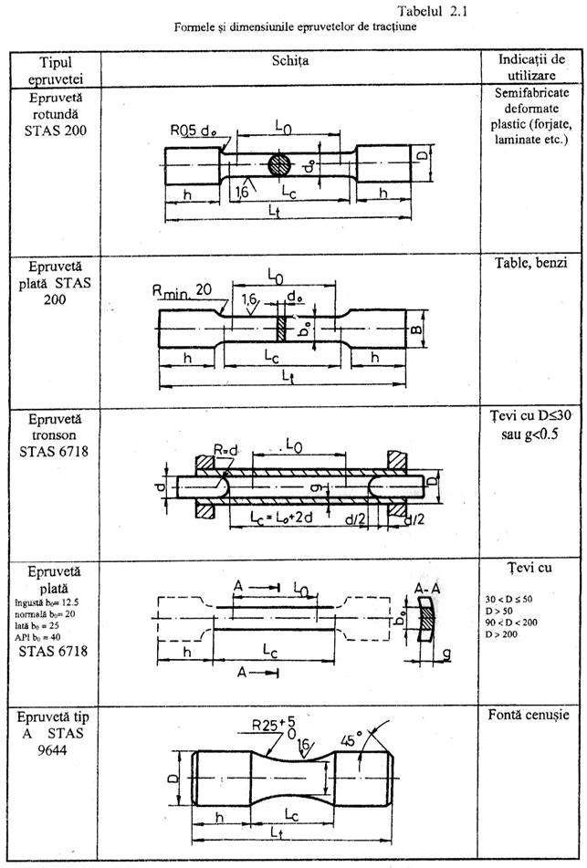 Formele si dimensiunile epruvetelor sunt functie de natura materialului si de tipul semifabricatului din care se preleveaza. În tabelul 2.1 sunt prezentate câteva din formele tipice de epruvete utilizate, iar în tabelul 2.2 termenii si notatiile specifice acestei încercari mecanice.