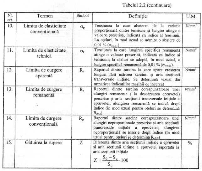- limita de elasticitate conventionala sp,0,01, sau limita de elasticitate tehnica sr,0,01, (vezi tabelul 2.2).